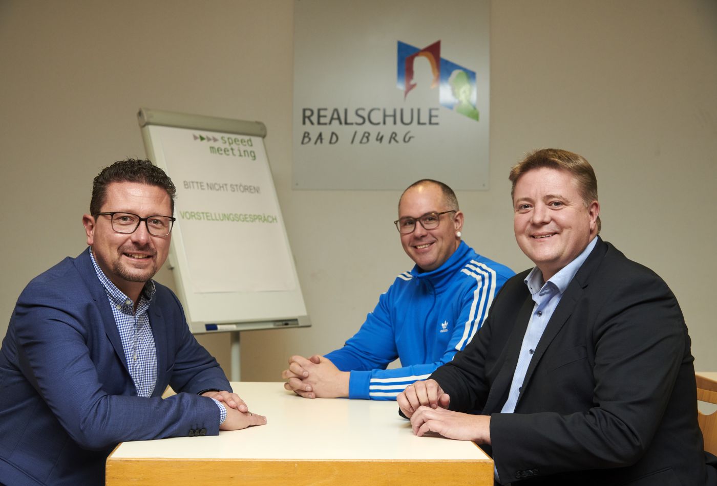 MaßArbeit-Vorstand Lars Hellmers (v.li.), Sebastian Gottlöber, Realschule Bad Iburg, und Bad Iburgs Bürgermeister, Daniel Große-Albers, freuen sich über den Erfolg der „Speed-Meetings“. Foto: Uwe Lewandowski