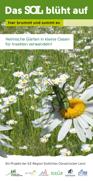 Höchste Zeit, auf die Bedeutung von Schmetterling, Biene & Co. für Natur, Tierwelt und uns Menschen im Südlichen Osnabrücker Land (SOL) aufmerksam zu machen. Dafür haben Bad Iburg, Bad Laer, Bad Rothenfelde, Dissen aTW, Glandorf und Hilter a.T.W gemeinsam das Projekt „Das SOL blüht auf – hier brummt und summt es ins Leben gerufen. Das Ziel: Unser schönes SOL zur insektenfreundlichen Region entwickeln! Unterstützt wird das Projekt von der Kreisgruppe Osnabrück des BUND e.V. und den Naturfreunden Glandorf e.V..